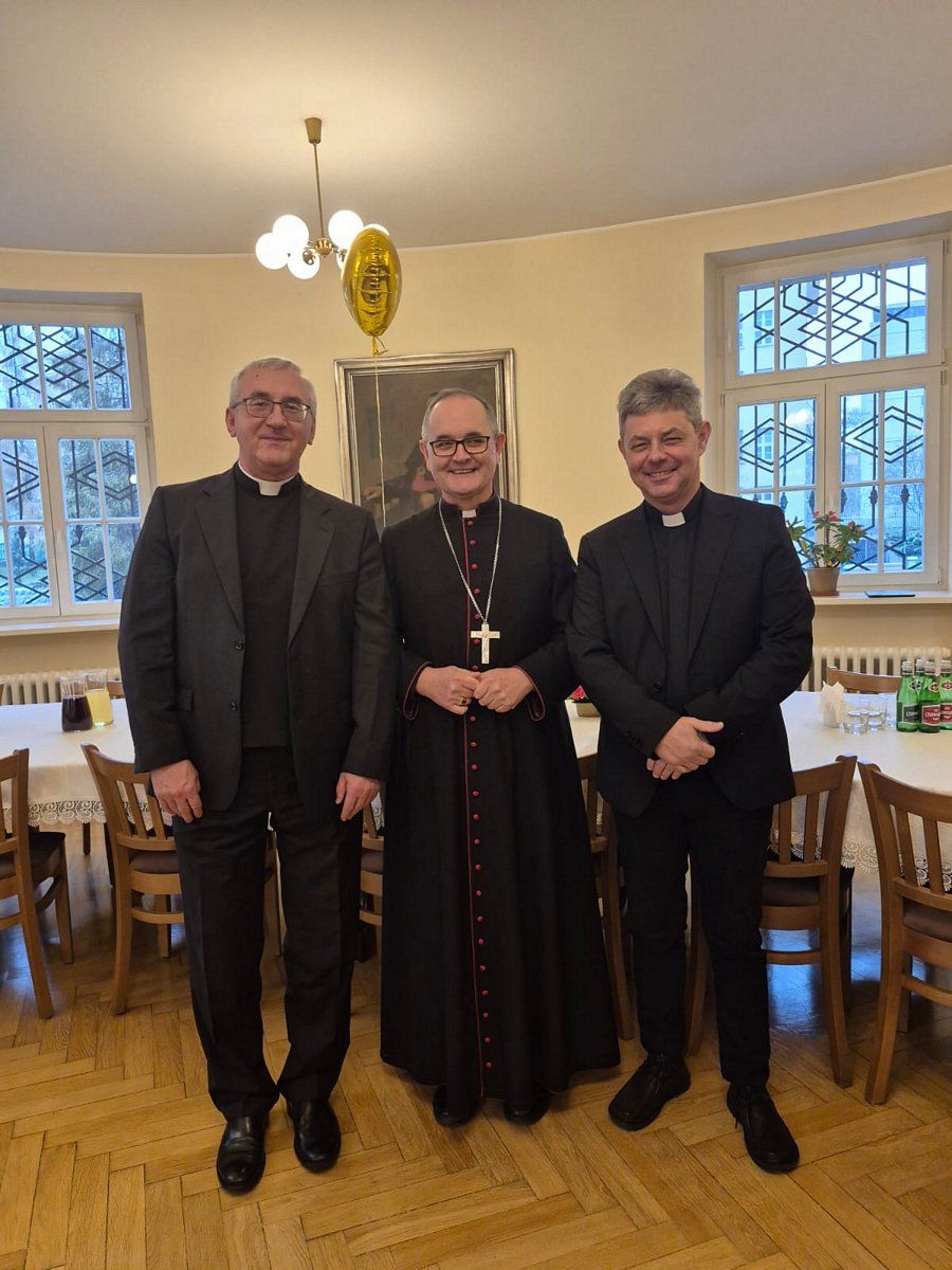 Dzisiaj, 26 listopada 2025r. ks. proboszcz Paweł wraz z ks. Mirosławem Sołtyskiem, proboszczem par. MB Anielskiej w Dąbrowie Górniczej złożyli wizytę Księdzu Arcybiskupowi Andrzejowi z racji Jego urodzin. Podczas przyjacielskiej rozmowy [ks. arcybiskup i nasz proboszcz na jednym roku rozpoczęli studia filozoficzno-teologiczne w Krakowie] oprócz wspomnień Metropolita katowicki przyjął zaproszenie na odpust parafialny w przyszłym roku. Ks. abp gościł w naszej parafii m.in na uroczystościach pogrzebowych śp. Bogusława Kościka jako ówczesny bp pomocniczy archidiecezji częstochowskiej.