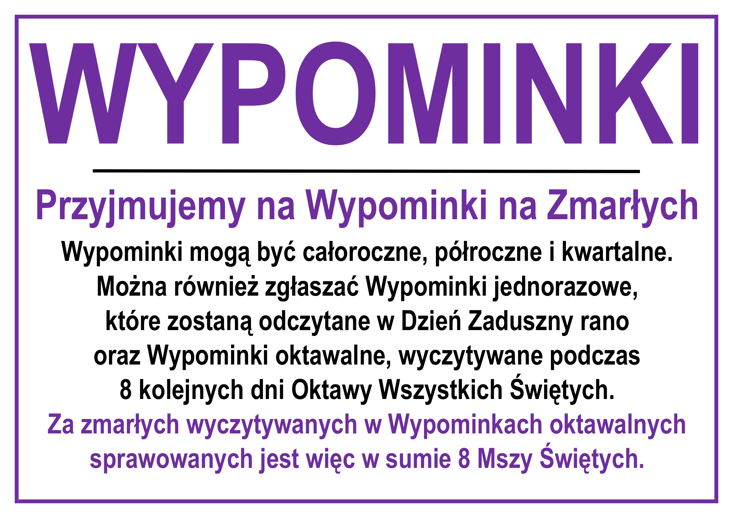 - Wypominki oktawalne od 1 do 8 listopada o godzinie 17.30, następnie Msza Święta w intencjach polecanych w wypominkach.